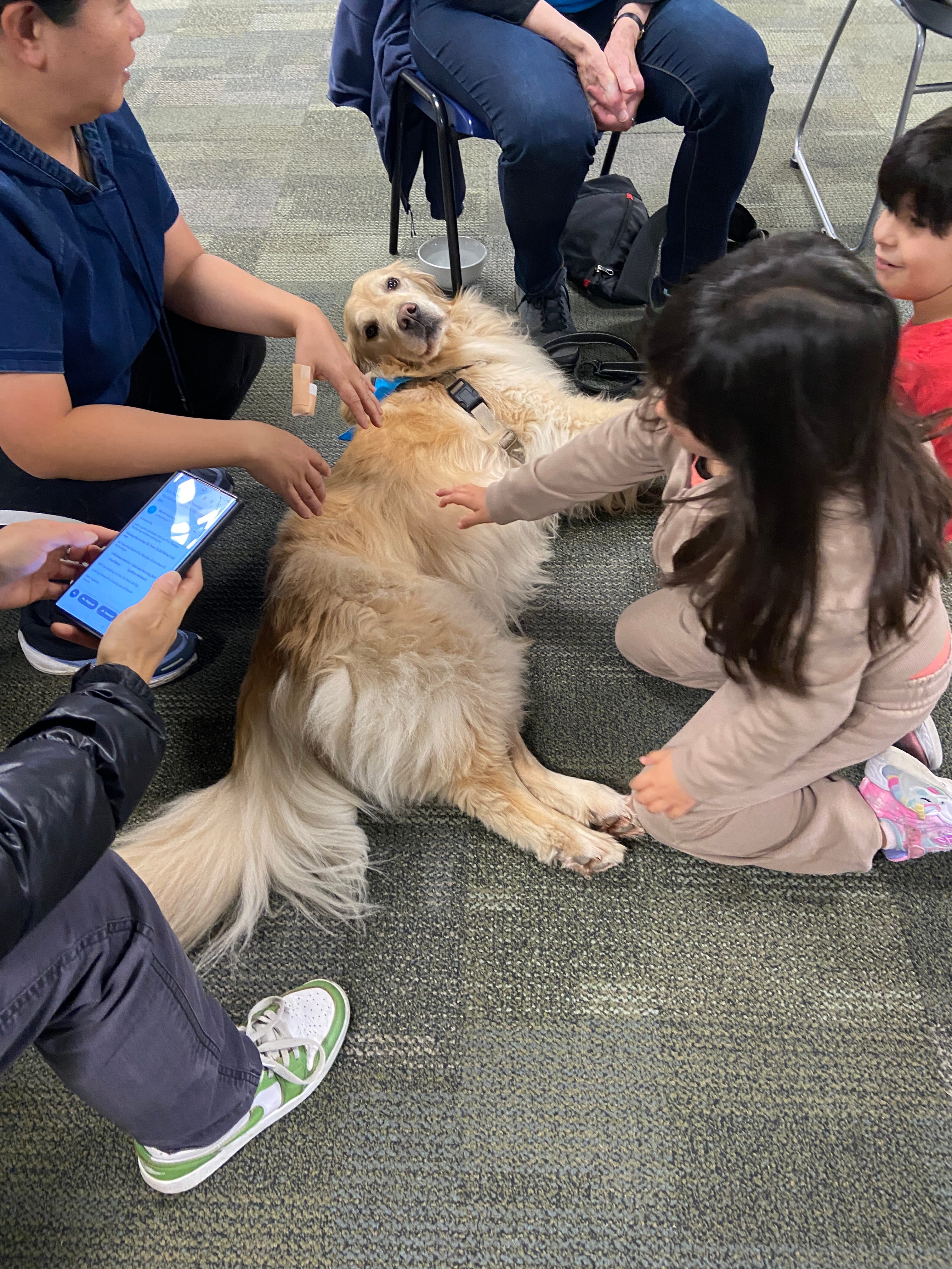 お昼くらいに3匹の犬がやってきた。プードルのミックスのようなパピーと、大型のゴールデンレトリーバー(たぶん)ともう1匹大型の犬。クライアントたち(移民や難民)も参加できたのでいろんな犬好きな人が集まってた。メキシコからの移民のお父さんと女の子、そしてそのお兄ちゃんが来てたけど、この女の子が犬を見てはケラケラと笑っていてまたそれがすごく可愛かった。癒された。