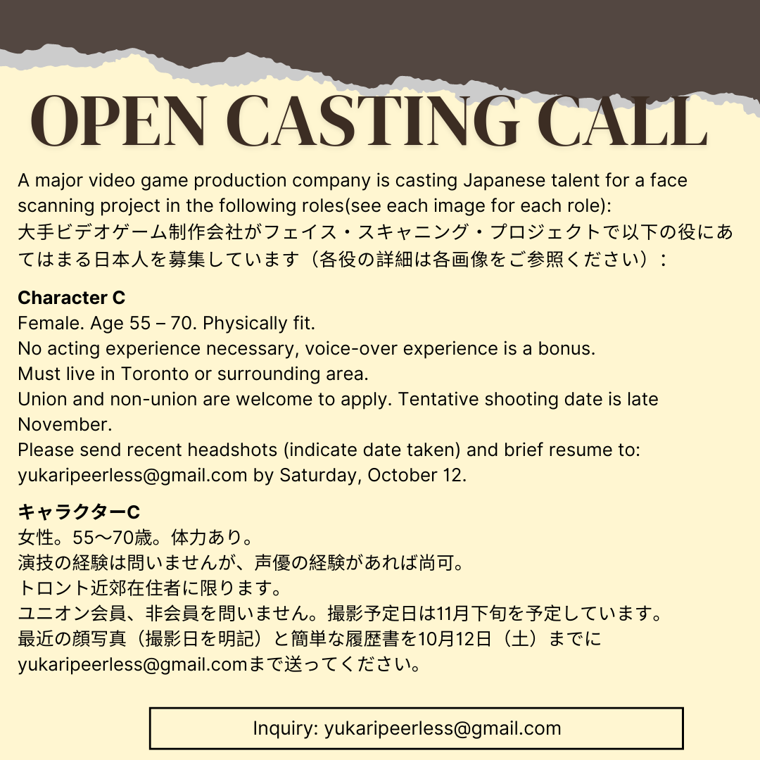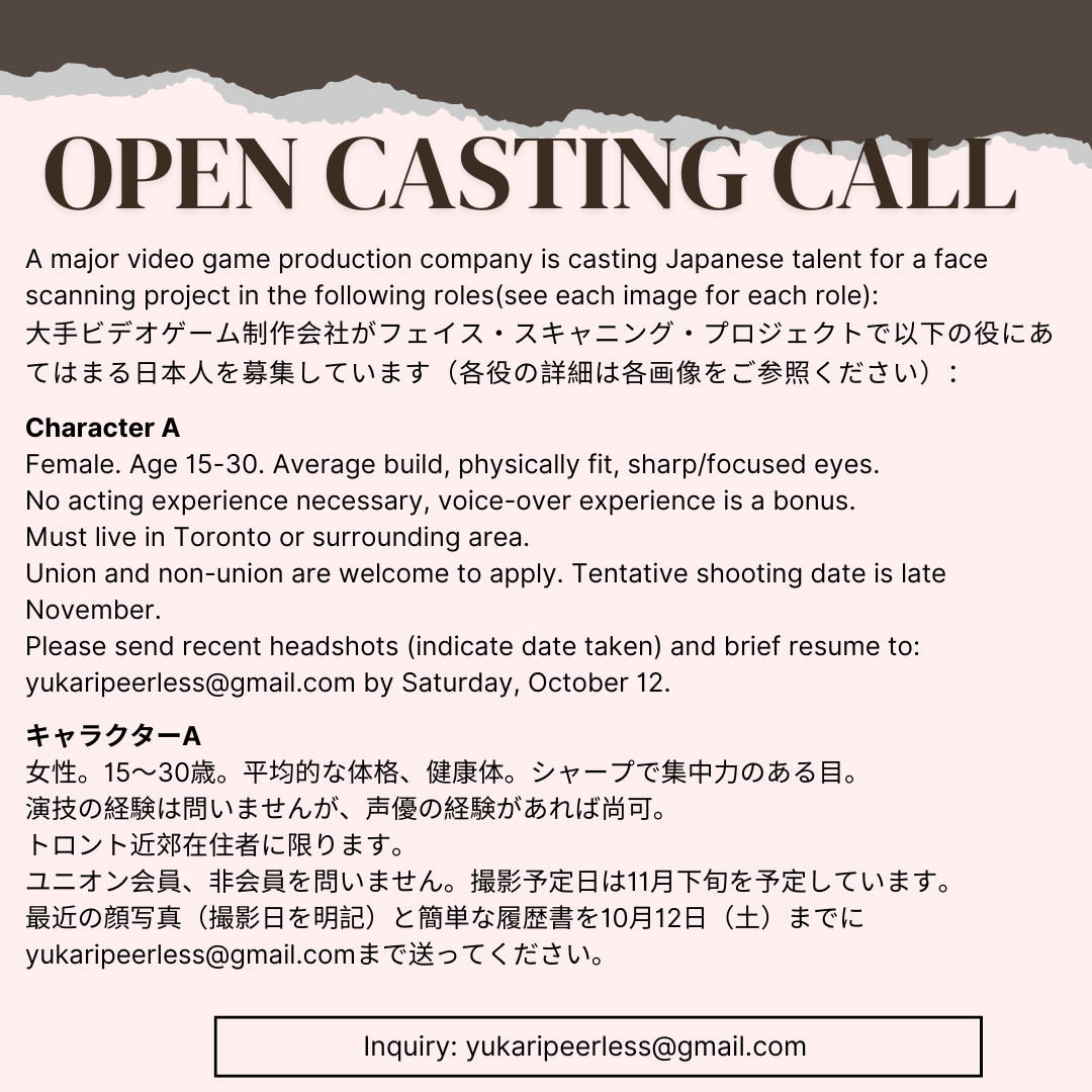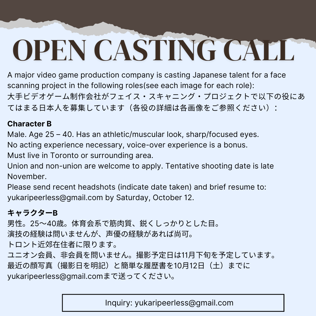 これは仕事の話。今キャスティングアシスタントとして、トロントの某大手ゲーム会社で探しているフェイス・スキャンニングのプロジェクトのために日本人(日系人もOK)を探しています。