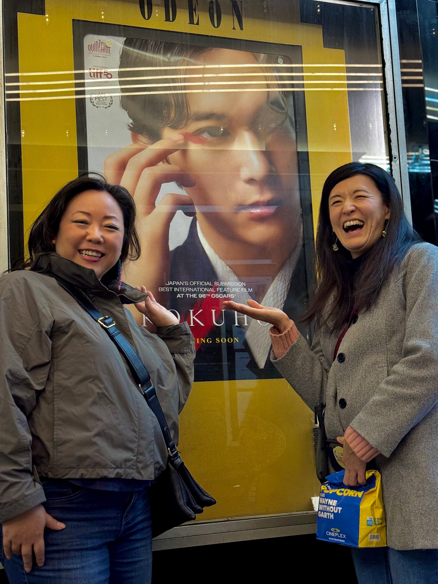 去年、ブラックフライデーの時期にCineplexの映画館でやってるCineClubのメンバーになった。1ヶ月$10くらいで、月1枚映画のチケットが無料になり、しかもそのチケットは使わない場合は繰り越せる。なので喜んでCineClubに参加したものの、12月、1月は特に観たい映画がなく、無料チケットが2枚になっていたのでそれで国宝を見に行くことに。日本ですでに1回観ているまみちゃんと、今回初めて観る夫の3人で行って来た。