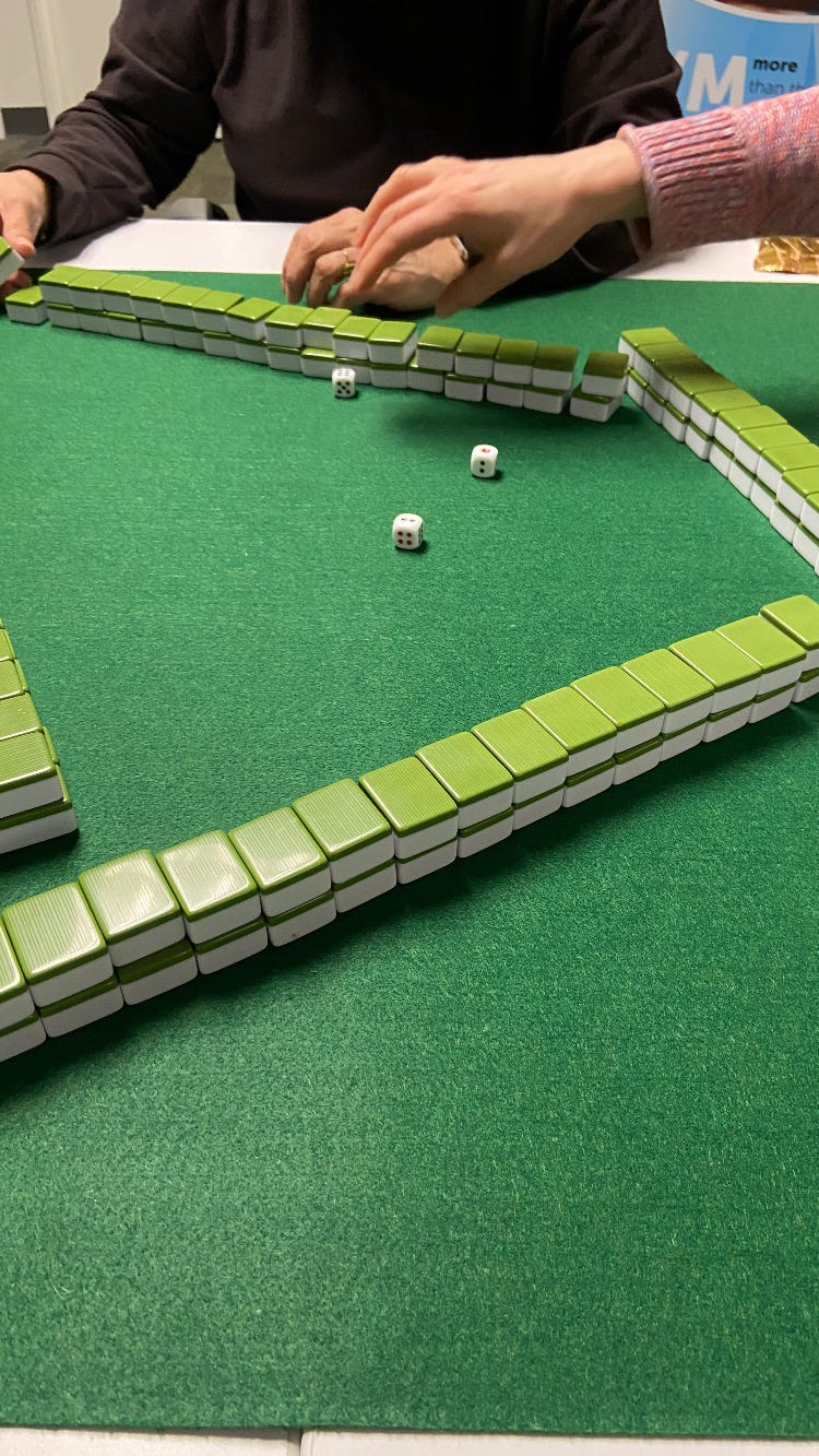 この日はちょうど12人(女11人、男1人)が集まり、90%が中国系の同僚。ポットラックディナーの後、早速3組に別れて開始。事前にルールを説明したYouTubeビデオを送ってもらっていたので、比較的スムーズに行った。時々間違えることもあったけど、ほとんどが初心者なので、誰も怒らないし(笑)、色々話しながら大笑いして遊んでほんとにあっという間に時間が過ぎた。結局私のテーブルは5回プレイしてみんな1回ずつ勝てた(一番経験の多いボスが2回勝った)のでみんな気分もよかった。麻雀って面白いな!ハマるのもわかる。今回は2回目で、仲のいいスタッフだけで集まってやってたけど、マネージャーが、「今後はオフィスで公表して、来たい人だれでも参加できるようにしよう。そうじゃないとなんかフェアじゃないじゃない」というので、これからも続く予定。また趣味が一つ増えた。